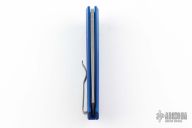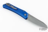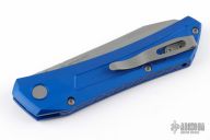 This Oligarch by Pro-Tech Knives features a stonewashed wharncliffe shaped blade. The handle has a blue anodized aluminum frame with a stainless deep carry tip up clip and a bead blasted button. Comes with original box and papers. New from maker.