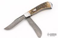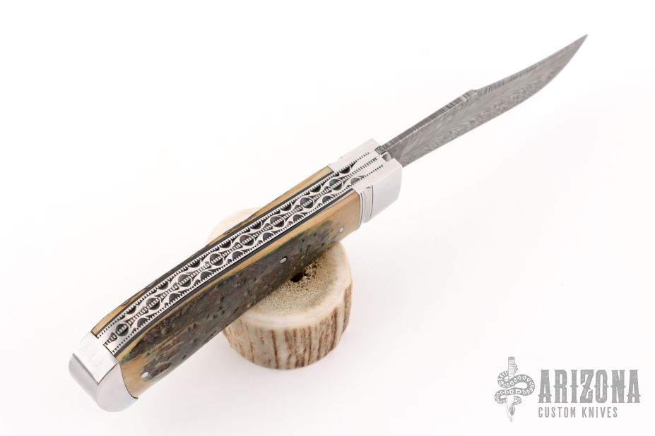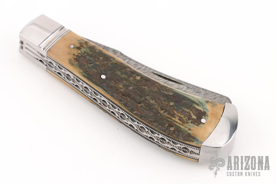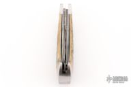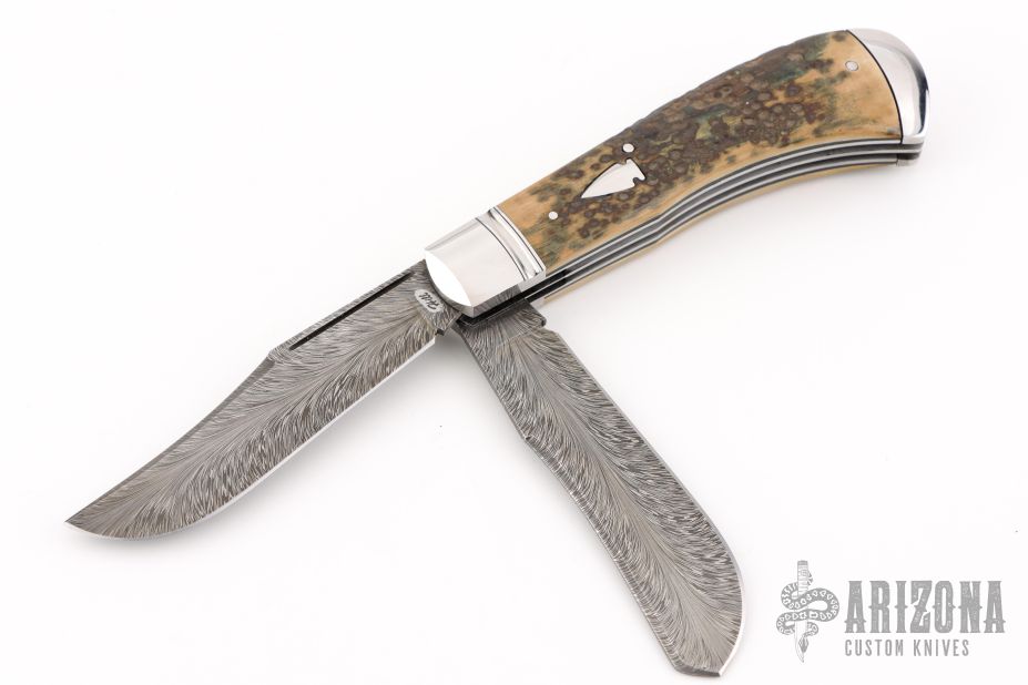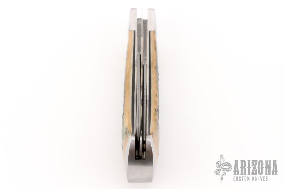 This "Hill Lock" Combo Trapper by Tobin Hill features feather Damascus blade with a nail nicks and false top edge.  The handle has fluted stainless steel bolsters, bark mammoth ivory covers with stainless steel escutcheon, fileworked stainless steel liners, and a fileworked stainless steel springs connected to the rear bolsters forming the "Hill Lock". Once open, press down on the rear bolsters to release the lock and close the mail blade. The other blade is a slipjoint with half-stop.  New from maker!