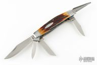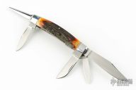 This 5-Blade Stockman by Toby Hill features hand rub satin finished blades with nail nicks. The handle has pinched stainless steel bolsters, amber stag covers with a stainless steel oval escutcheon, stainless steel liners and springs. Has half stops, flush in all positions. Comes with a zippered case. New from maker at the 2024 NCKS.
