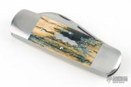 This Elephant's Toe by Jim Dunlap features hand rub satin finished blades with nail nicks. The handle has stainless steel bolsters with integral liners, mammoth ivory covers with a stainless steel escutcheon, stainless steel liners and spring. Has half-stop, flush in all positions. Comes with zippered case. New from maker at the 2024 NCKS.