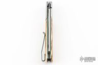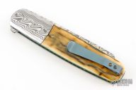 This MZ Wharncliffe front flipper by Brad Zinker features Damacore blade with checkered thumbrest and flipper. The handle has dovetailed Damasteel bolsters, mammoth ivory scales, anodized titanium liners with laser engraved interiors and a tip up anodized titanium clip. Rides on bearings, nice detent, lockup and blade seating. Excellent condition.