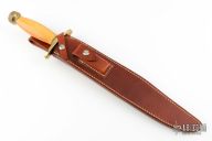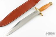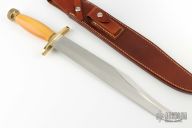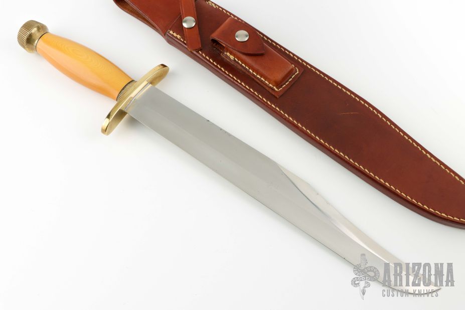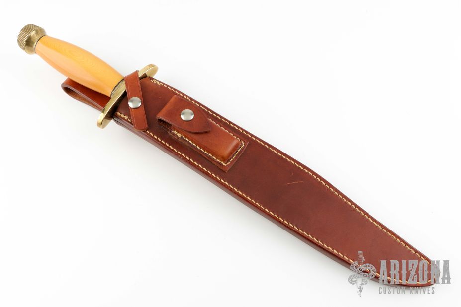 The 13" Randall Thorp Bowie by Randall Made Knives is similar to types used by Confederate troops. This one has an 13" carbon steel blade with sharpened top edge, .206" blade stock and 1.660" blade depth, hidden tang construction. The handle has a forward curved brass guard and butt cap, and a yellow Westinghouse paper micarta grip with black spacers. Comes with a brown leather sheath. Has some a few light scratches and light spots, otherwise excellent condition. Comes with a zippered case.