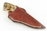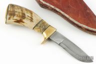 This knife by Chris Amos features a satin finished drop point blade with visible temper line, .134" blade stock and .914" blade depth, hidden tang construction. The handle has a brass guard, sheep horn grip and black and sheep horn spacers, brass butt. Comes with a brown leather sheath. Has a little patina on the blade, otherwise excellent condition.