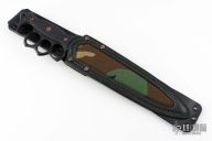 Embodying history and our own design philosophies, Lady Death is our rendition of the classic trench knife. We decided to go big, like no other, with a 15" overall length, and 9 5/8" CPM-Magnacut double-edge dagger blade with a long fuller down the middle. The knuckle duster style handle acts as a guard to protect your hands, and the aggressive outward shape works well for raking. To round out the overall shape, the end of the handle features a pronounced pomel for hammer-striking. The handle is finished with Dirty Olive G10 handle slabs with a checkered texture that is suitable in dry or wet conditions. The handle slabs are attached with Grade 5 Titanium fasteners that are electro-anodized in bronze to round out the look. Lady Death includes a brown leather sheath with a contrasting green canvas inlay. The sheath is ambidextrous, and can be worn on a belt or attached to PALS webbing.