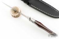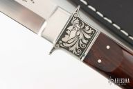 This Integral Fighter from Dietmar Kressler features a clip point hand rubbed satin finish blade with sharpened top edge, .230" blade stock and 1.080" blade depth at the ricasso. The handle has desert ironwood scales over integral construction with full tapered tang. Lanyard tube in pommel. The handle has been engraved with a Mayan theme by Rolf Peters. Includes a black leather sheath with belt loop and a zippered case. Excellent condition. A beautiful piece.