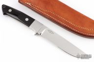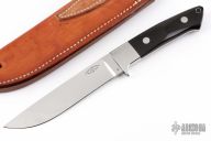 The Long Hunter by Bob Loveless features a mirror finished blade with the "R.W. Loveless maker Riverside CA" logo. Full tapered tang construction. .190" Blade Stock 1.059" Blade Depth. The handle has a stainless steel guard, buffalo horn scales with red liners, lanyard hole. #3. Comes with matching numbered leather sheath and a zippered case. Excellent condition.
