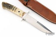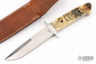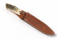 This Chute Knife from Dietmar Kressler features a hand rub satin finished blade with sharpened top edge, .175" blade stock and 1.062" blade depth, full tapered tang construction. The handle has a stainless steel guard and sheep horn scales with thin red liners, lanyard tube in pommel. Includes brown leather sheath with belt loop and a zippered case. Excellent condition. A beautiful piece.