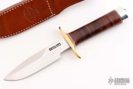 This Combat Companion by Randall Made Knives features a satin finished blade with sharpened top edge, .215" blade stock and 1.166" blade depth, hidden tang construction. The handle has a brass double guard, stacked leather grip with red/white/blue spacers and a duralumin butt. The Combat Companion is one of Randall's non-catalog knives. Includes a brown leather sheath and zipper case. Has a little patina on the guard, otherwise excellent condition.