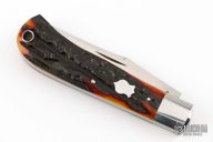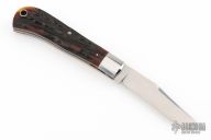 This Single Blade Trapper by Tim Robertson features a hand rub satin finished blade with nail nick and false top edge. The handle has stainless steel bolsters, stag covers, stainless steel liners and spring. Has half-stop, flush in all positions. Excellent condition.