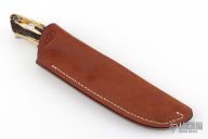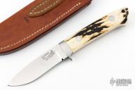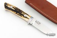 The classic Drop Point Hunter that made Bob Loveless designs so famous. Mirror finished drop point blade with the "R.W. Loveless maker Riverside, Calif." Double Nude logo. Full tapered tang construction. .167" Blade Stock .998" Blade Depth. The handle has a stainless steel guard and stag scales with red liners, lanyard hole. #430. Comes with matching numbered leather sheath and zipper case. Has a couple very light scratches, otherwise excellent condition.