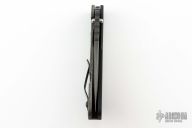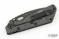 This Mick Strider SMF Fatty framelock folder features a black blade with thumbhole and notched thumbrest. The handle has a black aluminum and flame finished titanium frame with titanium clip, tip up carry. Jimping on blade spine. Nice lockup, detent, and blade seating. NSN: 1095-01-531-5015. Has some scuffs and scratches, otherwise good condition.
