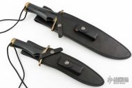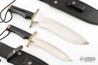 This Small Sasquatch by Randall Made Knives features a satin finished recurve blade with sharpened top edge, .223" blade stock and 1.419" blade depth, hidden tang construction. The handle has a brass double guard, brass butt, black linen micarta handle with black/brass spacers. Comes with a black leather sheath. Has a couple light scuffs, otherwise Excellent condition. This one is stainless.