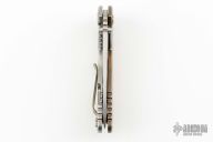This XM-18 by Rick Hinderer features a stonewashed blade with notched thumbrest and flipper. The handle has a bronzed titanium scale and stonewashed titanium frame with a titanium tip up pocket clip and filler tab.  Includes extra hardware.  Includes the original box and papers.  Excellent condition.