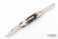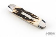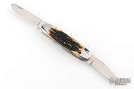 This knife by Terry Davis features 2 hand rub satin finished blades with nail nicks. The handle has mirror polished stainless steel bolsters, jigged bone covers with stainless steel bullet escutcheon, stainless steel liners, and stainless steel springs. Comes with nylon zippered case. Has a nice snap. Excellent condition.