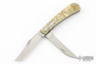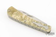 This slipjoint by Jeffery Mitchell features a two hand rub satin finished blades with nail nicks. The handle has stainless steel bolsters, file worked liners liners, sheep horn covers, stainless spring, escutcheon, and has half-stop. Blades are flush in all positions. Excellent condition.