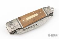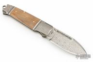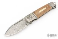 This Mini Butcher slipjoint by Andre De Villiers features a polished Damasteel blade with fullers. The handle has a two-tone stainless steel frame, mammoth ivory covers with a nickel silver escutcheon, pins, stainless steel spring and lanyard hole at the butt. Has half-stop. Nice smooth function, lockup and blade seating. Laser engraved bolsters front and rear. Has a couple light scratches, otherwise excellent condition.