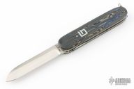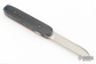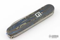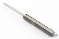 This Switch Army Switchblade by Chuck Gedraitis features a satin finished blade with false top edge. The handle has black/gray/blue micarta scales, orange peel finish titanium liners, backspacer with lanyard hole. Has tweezers and toothpick like a Swiss Army Knife. Nice action, lockup and blade seating. Excellent condition.