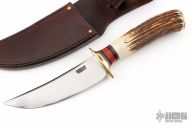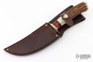 This Hunter by Jim Behring features a satin finished convex ground blade with a false top edge, .212" blade thickness and 1.319" blade depth, hidden tang construction. The handle has a brass guard and butt, stag grip with brass pin, black/brass/red spacers. Great look and feel. Comes with brown leather sheath. Excellent condition. Dated 2016