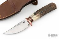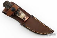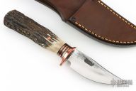 This knife by Rocco Handmade features a satin finished blade with hammermarked flats, .171" blade thickness and 1.008" blade depth, hidden tang construction. The handle has a copper guard, stag grip, black/copper spacer pattern. Great look and feel. Comes with brown leather sheath. Excellent condition.