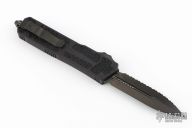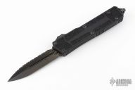 The Microtech Scarab II is a high quality tactical out-the-front knife, based on the original Microtech Ultratech design. Built to withstand the extreme, the Scarab II excels in high-intensity covert operations. The Scarab II is designed for a broad spectrum of utility and close quarter combat applications for use by qualified law enforcement, military, and government agency operatives. The Scarab II is fabricated to the highest possible standards to assure reliability and safety with its use. Featuring a one-handed, open and close, dual-action out-the-front (OTF) design, and double edge blade. The Scarab is produced with a large easy-to-grip handle that contains non-slip grip inlays on both sides. Comes with original box and papers. Excellent condition.