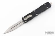 This Dirac Delta OTF automatic by Microtech features a D/E stonewash finish blade with a partially serrated edges. The handle is black aluminum with stainless steel tip down clip. Serial number 7957 dated 02/2023. Excellent condition. Comes with original box and papers.