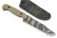 The CPM 3V blade is ground with a Hybrid Fuller™ to reduce the overall weight and bring symmetrical balance to the knife. The extra high flat ground bevel meets the swedge grind seamlessly, leading to the reinforced tip. The blade is assembled with our custom turned hardware made from 303 stainless steel and is fitted with a fold over MultiCam® Black KYDEX® sheath, which accepts all Toor Knives mounts.