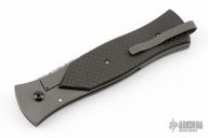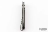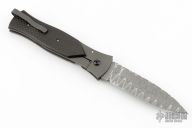 This linerlock by John Kubasek features a Stainless Damascus blade with fileworked spine and a single ruby inlaid thumbstud.  The handle has a bead blasted titanium frame with a matching tip up pocket clip, carbon fiber scales and backspacer. Includes a padded zippered case. New from maker!