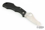 This Jester by Spyderco features a satin finished fully serrated blade with thumbhole and notched thumbrest. The handle has a black FRN frame with stainless steel backspacer. Comes with original box. Excellent condition.