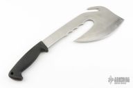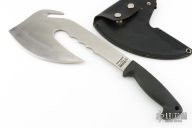 Wicked looking axe designed by Ken Warner and Mike Stewart of Blackjack Knives. Blade is .173" thick and about 7.5" cutting edge, has gut hook on back. 15.75" overall with a rubber handle. Comes with original sheath with one broken snap. Has some light scratches, otherwise excellent condition. Blade Steel: Aus8