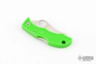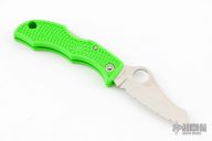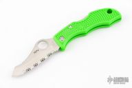 This Jester by Spyderco features a satin finished fully serrated blade with thumbhole and notched thumbrest. The handle has a green FRN frame with stainless steel backspacer. Comes with original box. Excellent condition. 157V on the blade.