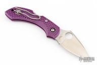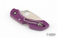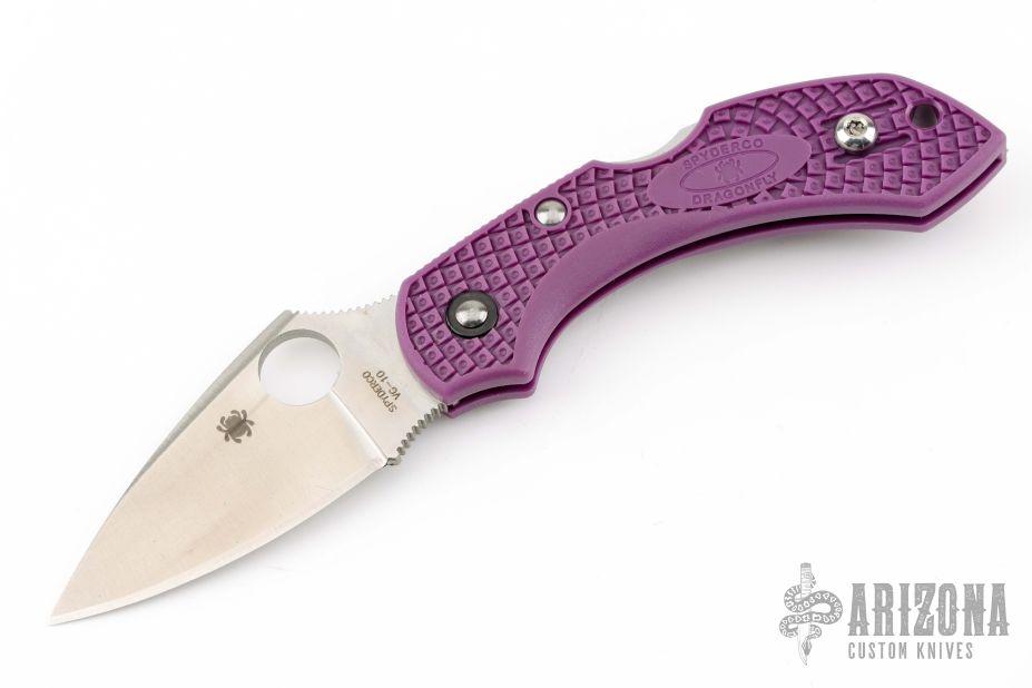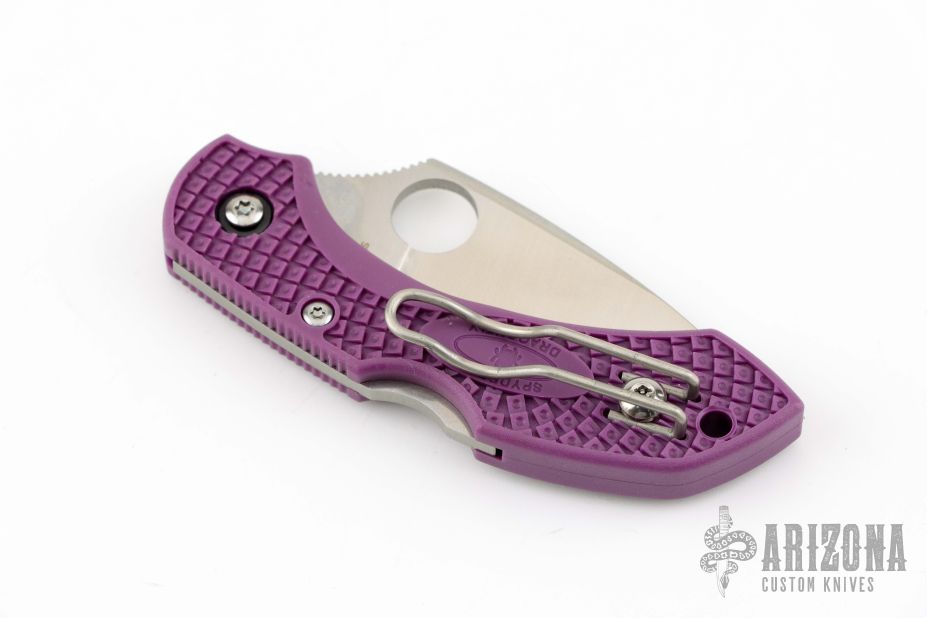 This Dragonfly II by Spyderco features a satin finished blade with thumbhole and notched thumbrest. The handle has purple FRN scales, stainless steel backspacer, and a tip up clip, left or right reversible. Comes with original box and papers. Excellent condition.