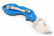 This Lava by Spyderco is a Chad Los Banos Design. If features a satin finished blade with notched thumbrest and thumbhole. The handle has blue G-10 scales, stainless liners and backspacer, stainless tip up clip (left or right reversible) and a lanyard hole. comes with original box and papers. Excellent condition. This is a sprint run knife.