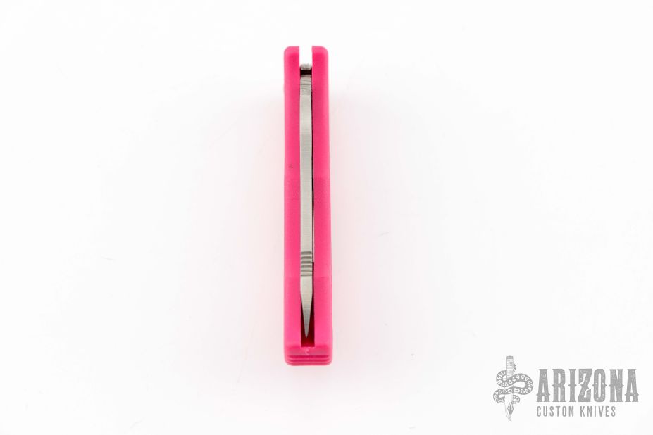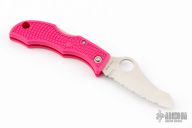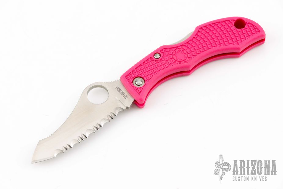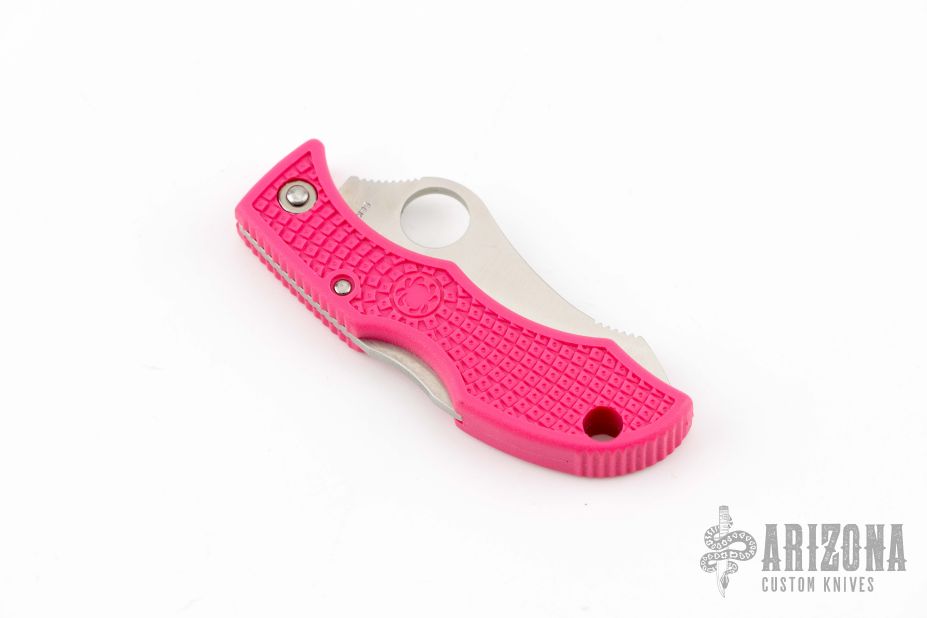 This Jester by Spyderco features a satin finished fully serrated blade with thumbhole and notched thumbrest. The handle has a pink FRN frame with stainless steel backspacer. Comes with original box. Excellent condition.