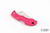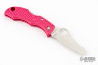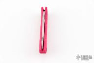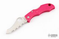 This Jester by Spyderco features a satin finished fully serrated blade with thumbhole and notched thumbrest. The handle has a pink FRN frame with stainless steel backspacer. Comes with original box. Excellent condition.