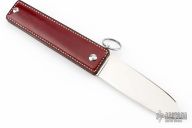 This knife by Eloi Pernet features a mirror polished blade with nail nick. The handle has brown leather scales with stainless steel liners and backspacer. Comes with original box. Has some light scratches, otherwise excellent condition.