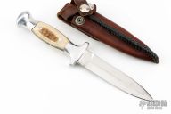 This Ruana Dagger features a satin finished double edged blade with .180" blade stock and .996" blade depth, hidden tang construction. The handle has a cast aluminum grip with stag inlays. Comes with a brown leather sheath. Has some scratches, otherwise good condition. No markings on the knife.