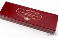 This Green River knife from J. Russel features a satin finished blade with .119" blade stock and 1.315" blade depth, full tang construction. The handle has checkered wood scales with brass pins and escutcheon. Comes with original box. Excellent condition.