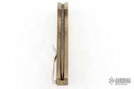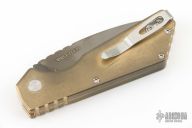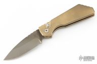 This PT+ Auto is a collaboration between Protech and Strider features a smoky gray coated drop point blade. The handle has an aluminum bronze frame with a stainless tip up clip. Pearl inlaid button. Comes with original box and papers. Has some light scuffs and patina, excellent condition otherwise.