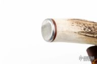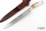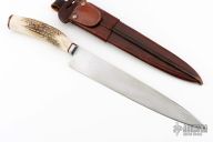 This is a Arbolito gaucho knife by H. Boker & Co has a carbon steel blade with integral guard, .200" blade stock and 1.528" blade depth, hidden tang construction. The handle has a stag grip and a steel butt, red spacers. Comes with a brown leather sheath. Has some light scratches, otherwise excellent condition.