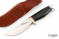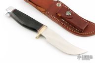 This Model 22 Outdoorsman by Randall Made Knives features a satin finished blade with notched thumbrest, .170" blade stock and 1.267" blade depth, hidden tang construction. The Model 22 is a thinly-beveled blade for the professional outdoorsman. The handle has a nickel silver guard, black linen micarta handle with red/white/blue spacers, duralumin butt. Comes with a brown leather sheath. Excellent condition.