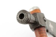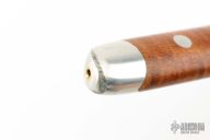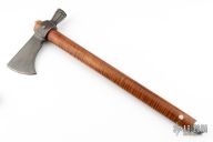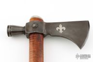 This Pipe Tomahawk by Ryan Johnson features an antiqued head with a 3.25" cutting edge, 8.125" from edge to pole. Has a curly maple haft with nickel silver cap with a finale that unscrews for the carb of the pipe, has an antiqued nickel silver mouth piece. Excellent condition. Very cool piece. Made in the mid-90s.