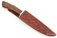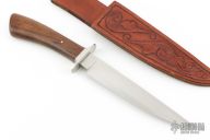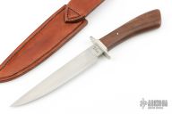 This fighter by Brian Thie was one of his 5 Journeyman Smith test knives, which he passed! It features a hand rub satin finished 9260 steel blade with .191" blade stock and 1.039" blade depth, hidden tang construction. The handle has a stainless steel guard and stabilized walnut grip with single pin. Comes with a hand tooled brown leather sheath. Comes with a picture of the 5 knives that he tested for Journeyman Smith. Has some light scratches, otherwise excellent condition.