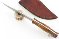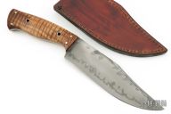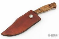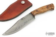 This Bowie by Matt Lamey features a hand rub satin finished clip point blade with a sharpened top edge and nice hamon, .171" blade stock and 1.739" blade depth, full tang construction. The handle has curly hickory scales with steel pins. Excellent condition. Comes with a brown leather sheath buffalo nickel belt stud.