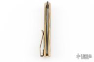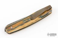 This T Arc Front Flipper by Brad Zinker features a Vegas Forge Damascus blade with checkered thumbrest and flipper. The handle has mammoth ivory scales, anodized titanium liners with laser engraved interiors and a tip up anodized titanium clip. Rides on bearings, nice detent, lockup and blade seating. Comes with zippered case. Excellent condition.