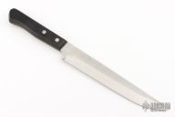This Muteki by Carter features a satin finished laminated blade with a mortise tang construction, .098" blade stock and 1.241" Blade Depth.  The handle has a pinned wood grip. Comes with original box. Has some patina, and some scratches. Excellent condition otherwise.