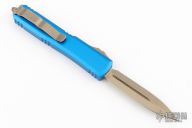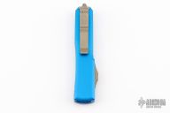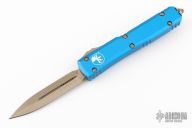 This Ultratech by Microtech features a stonewash bronzed double-edged blade with fullers. The handle has a blue aluminum frame with bronzed stainless steel hardware. Comes with original box and papers. Excellent condition. Dated 03/2022 and s/n 240936.