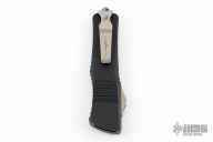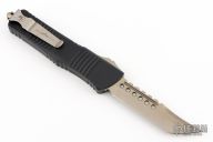 This Combat Troodon by Microtech Knives features a bronzed Hellhound blade with satin flats. The handle has a black aluminum frame with tip down bronzed stainless steel clip and hardware. Comes with original box and papers. 07/2018. Has some scuffs, scratches, on the frame and clip as well as couple light dings in the frame. Great condition otherwise.