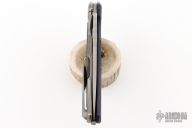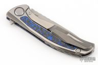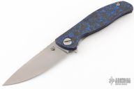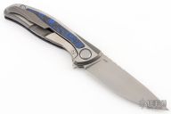 This Hati Gen3 by Shirogorov Knives features a drop point blade with notched thumbrest and flipper. The handle has Blue Techno Carbo and titanium frame with Blue Techno Carbo inlay, titanium tip up clip with hidden screws, titanium backspacer with lanyard hole. Rides on bearings, nice detent, lockup and blade seating. Comes with COA and original box. Has some scuffs and scratches on the frame and clip. Great condition otherwise.
