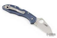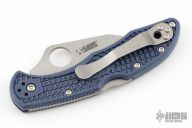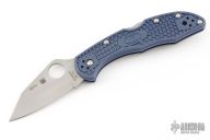 This knife by Spyderco has a matte finished blade with thumbhole opener and notched thumbrest. The handle has blue FRN scales and a 4-way reversible stainless clip. Comes with original box and papers. Excellent condition.