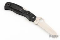 This C45SBK Rescue from Spyderco features a sheepsfoot style satin finish blade with full serrations and thumb hole. The handle is comprised of textured black FRN over stainless steel lock back. Reversible black coated steel clip positioned for tip up carry. Includes original box. Excellent condition.